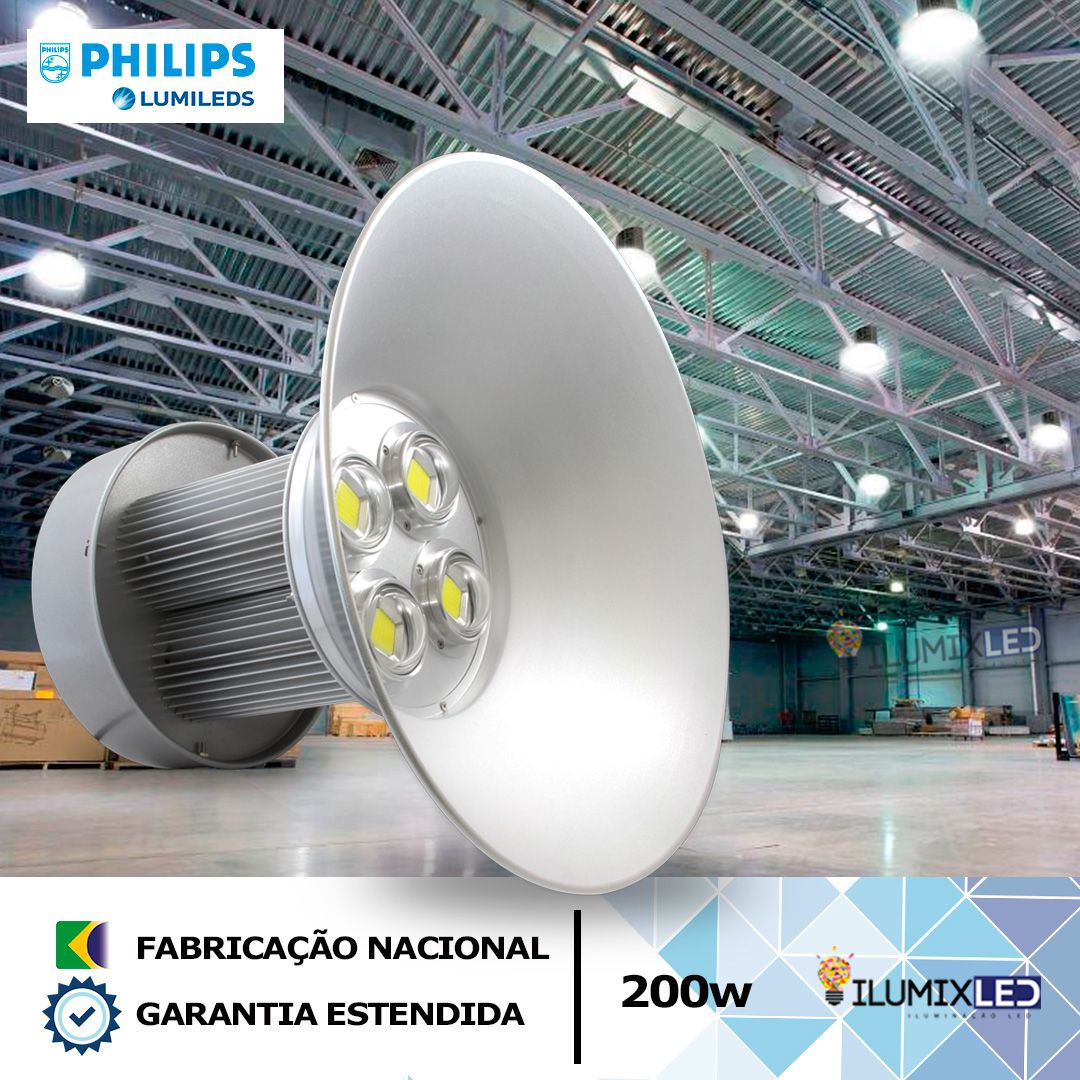 Tem baixo custo de energia por utilizar a tecnologia LED SMD PHILIPS produzindo um maior rendimento, uma iluminação uniforme de alta qualidade, fácil instalação, acompanha corrente e gancho para fixação na estrutura do galpão.