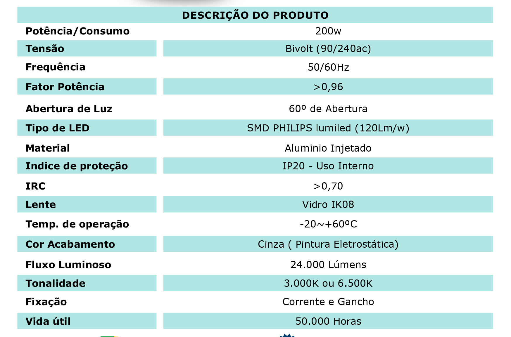 Produto de fabricação nacional com LEDs e Drivers da Philips integrados ao produto e eficiência luminosa de 120Lm/w.