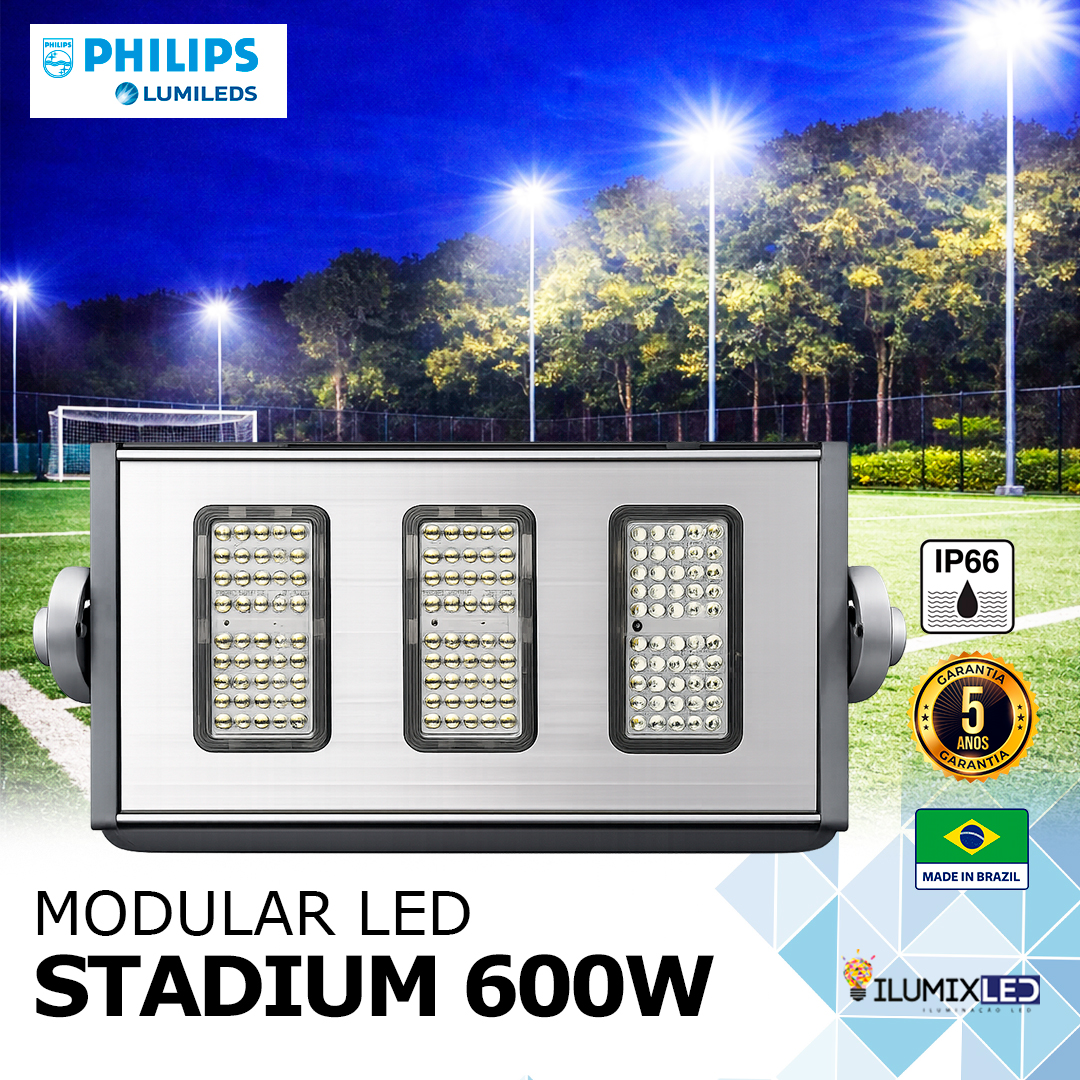 O Refletor LED SMD 600w Modular de alta potência da linha profissional foi projetado com design moderno, a melhor qualidade em materiais e componentes, é um Refletor LED totalmente diferenciado do mercado, com fabricação nacional 100% Brasil, produção exclusiva, desenvolvido em alumínio extrudado e anodizado tem alta performance e melhor rendimento por utilizar LED LUMILEDS Philips®, baixa manutenção, ótima dissipação de calor, proporcionando maior durabilidade e vida útil.